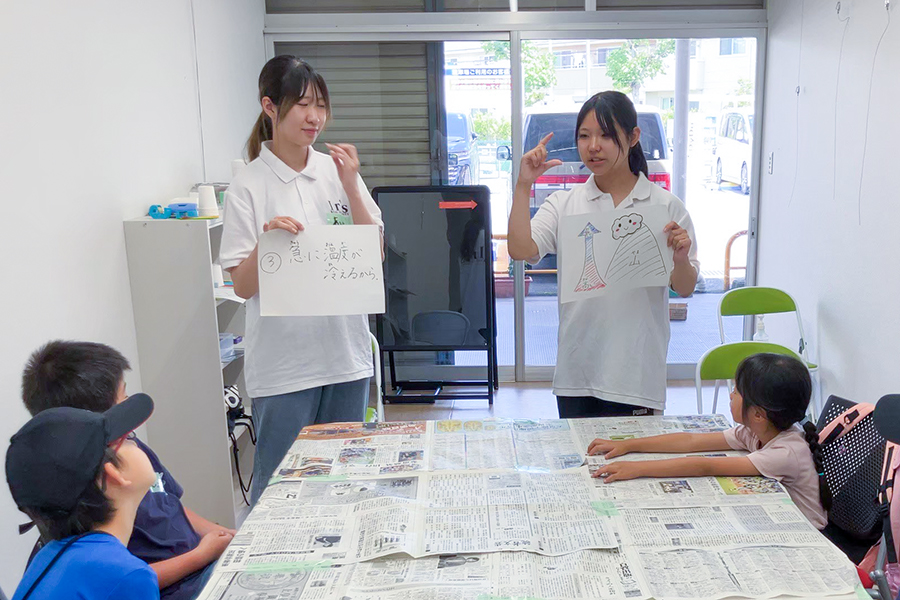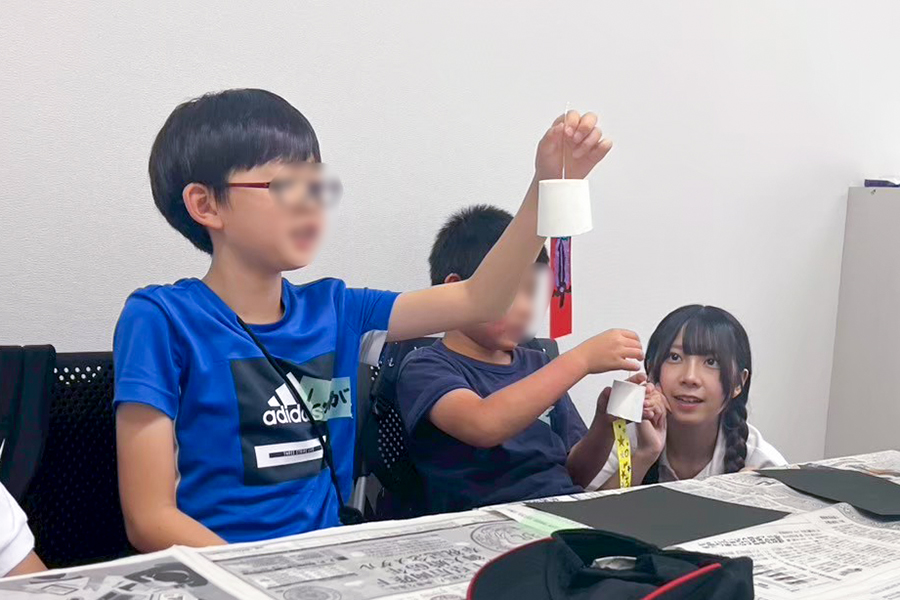 今回の企画は、ドライアイスを扱うため準備が大変で成功するか不安でしたが、周りの力に支えられて無事に成功しました。子どもたちが興味をもって取り組み、実験中から考える姿をみることができて企画者としても安心しました。風鈴づくりでは、たくさんの材料を用意して子ども一人ひとりのオリジナル風鈴が作れるようにしました。私たちの予想以上に個性があふれる作品がたくさん作られていて驚きました。今回の企画を通して、子どもたちは、実験や工作でも自然と考えを巡らせていたり、たくさんの材料から個性豊かな風鈴が作れる創造力を持っていたりと、改めて子どもたちの学ぶ意欲は逞しく、パワフルだと感じました。子どもたちから学んだ「自ら学ぶ姿勢」を胸にこれからも頑張っていきます!