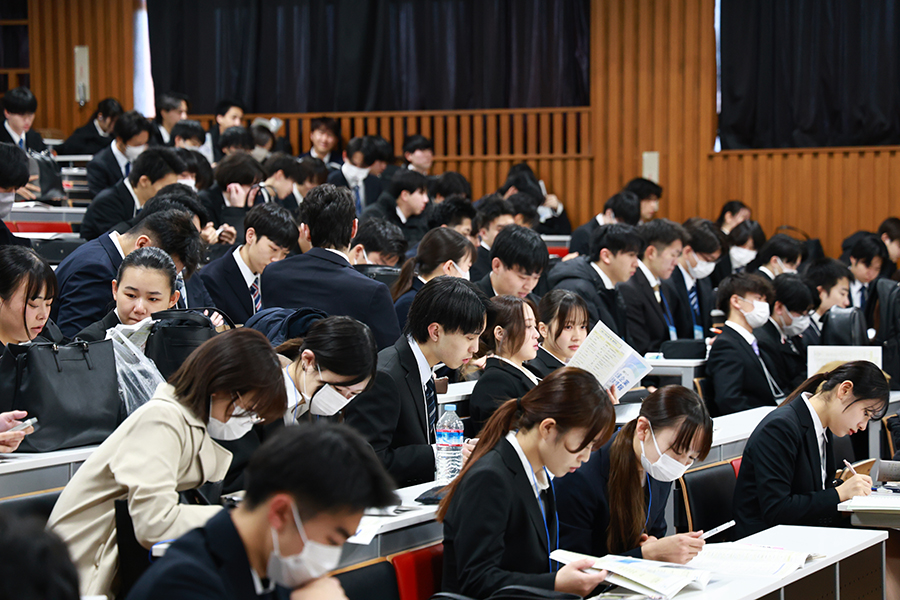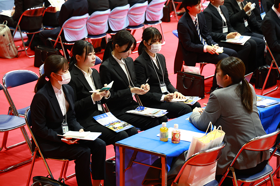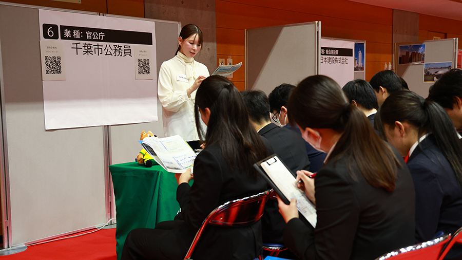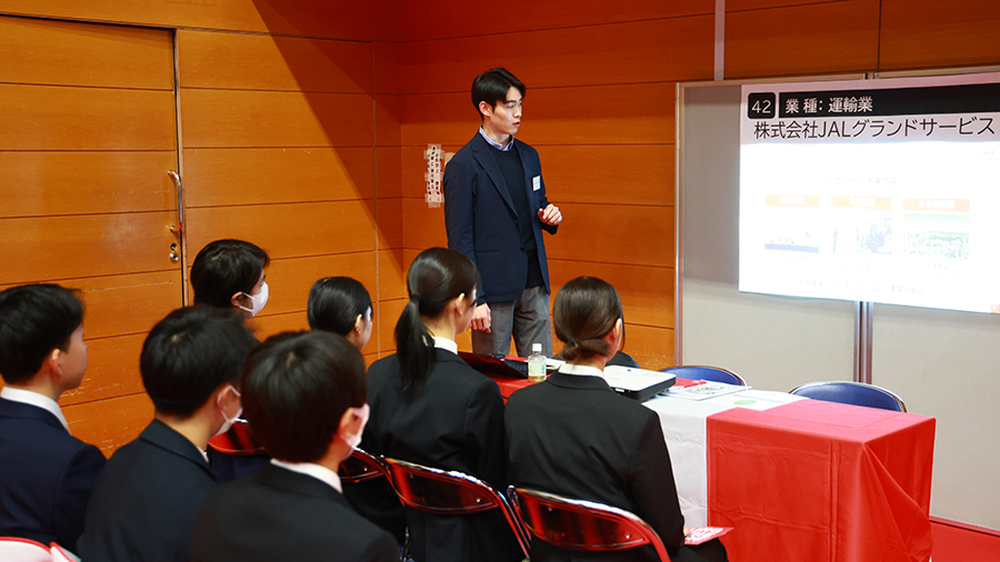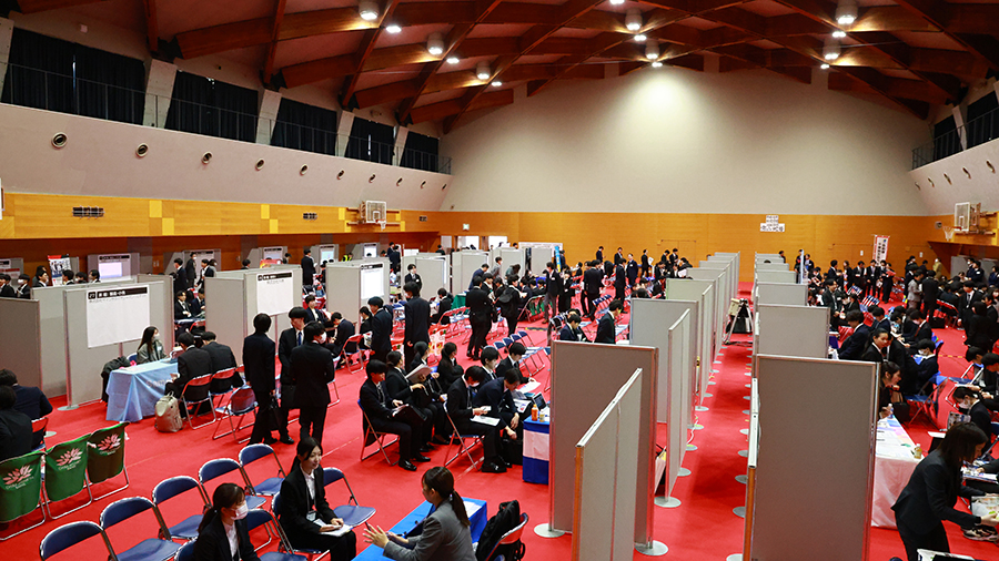 開会にあたり、キャリアセンター職員より「本日来学している企業はいずれも優良企業です。社名を知らなくても、福利厚生や働く環境は大手企業と遜色ありません。ぜひ自分自身を知ってもらい、就職への意欲を積極的に伝えてください」との言葉がけがあり、学生たちの背中を押しました。
