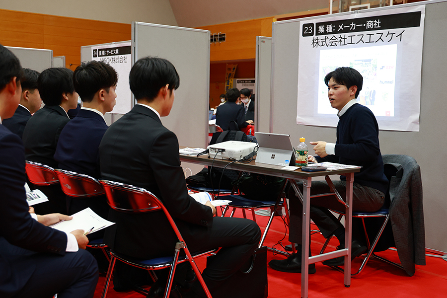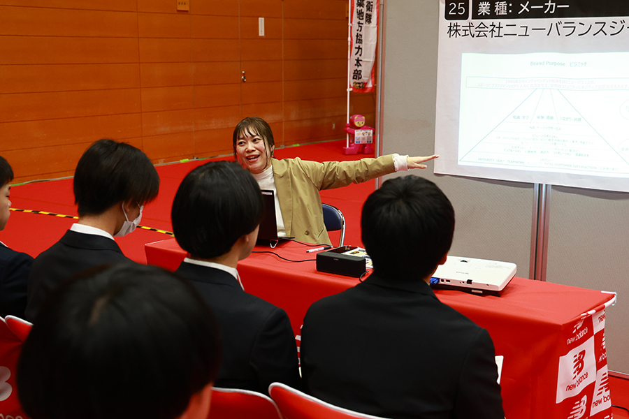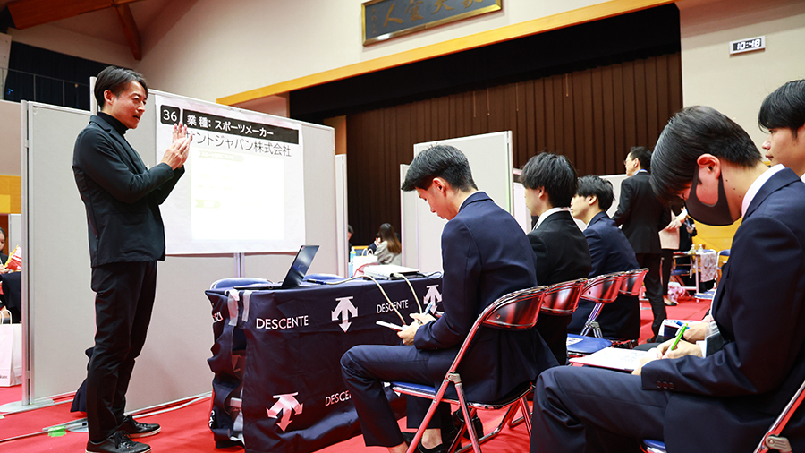 今年度は、学生からの要望が特に多かったスポーツ用品メーカー3社が来学しました。そのうち、株式会社ニューバランスジャパンおよびデサントジャパン株式会社は、今年度すでに本学学生への内定実績があります。ブースには、大学や高校時代に部活動に打ち込んできた学生が多く集まり、活気にあふれていました。