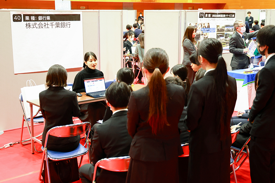 12月23日(火)、敬愛大学がオススメする企業等の採用担当者をお招きし、敬愛大学最大の就職イベント「就職フェア(学内合同企業説明会)」を開催しました。学生が将来につながる就職先に出会えるよう、「千葉県内外の優良企業」や「公務員」など、49の企業・団体にご参加いただきました。