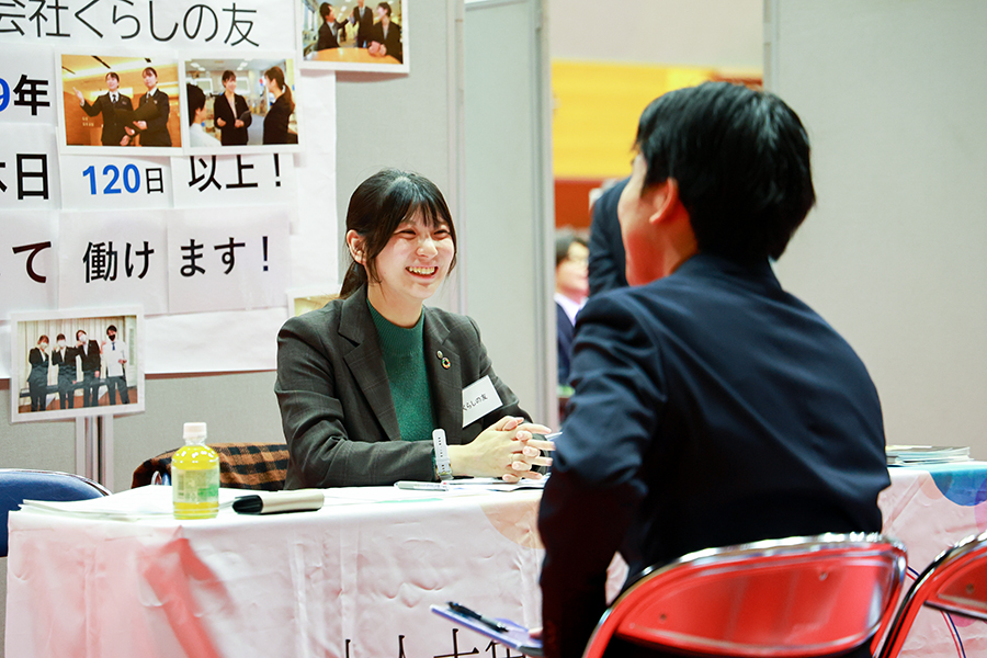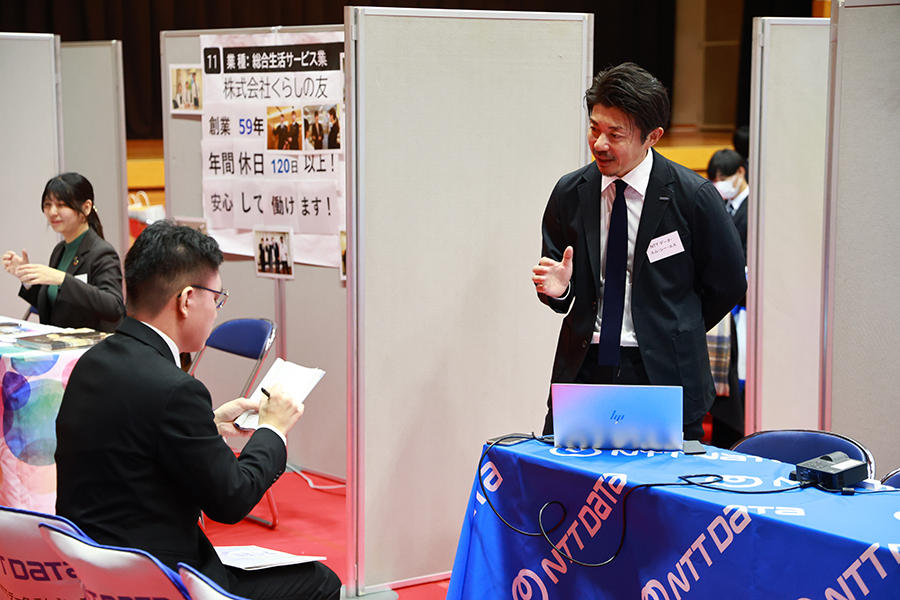 就職フェアが始まると、各ブースでは学生が真剣な表情で説明に耳を傾け、熱心に質問する姿が多く見られました。採用担当者も学生一人ひとりを温かく迎え、終始和やかな雰囲気の中で交流が進みました。雑談を交えながら会話が弾む場面もあり、双方にとって実りある時間となった様子でした。どのブースに参加するか迷う学生に対しては、キャリアセンター職員が声をかけ、「今は知らない業界でも、話を聞くことで新たな関心が生まれるかもしれません。まずは一歩踏み出してみましょう」と後押ししていました。