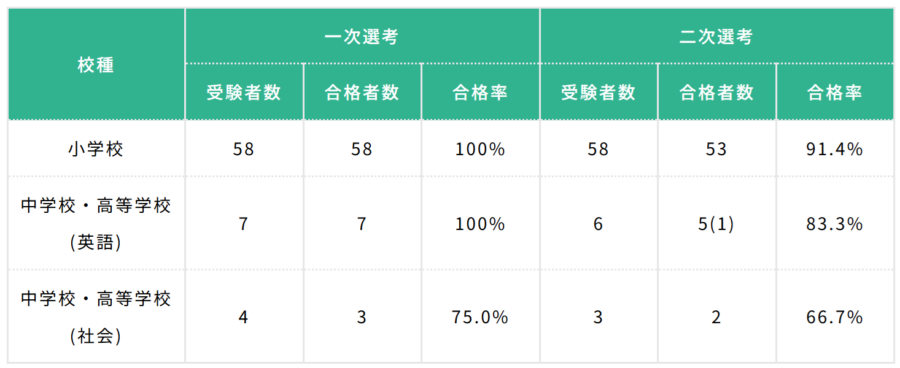 千葉県・千葉市全体の二次選考合格率は、小学校で75.8%、中学校・高等学校(英語) で51.5%、中学校・高等学校(社会) で19.9%です。