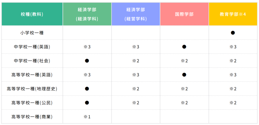 ※1 経営学科の必要単位数の修得により取得可能。※2 経済学科の必要単位数の修得により取得可能。※3 国際学部の必要単位数の修得により取得可能。※4 教育学部は敬愛短期大学の科目等履修生として幼稚園二種免許も取得可能。