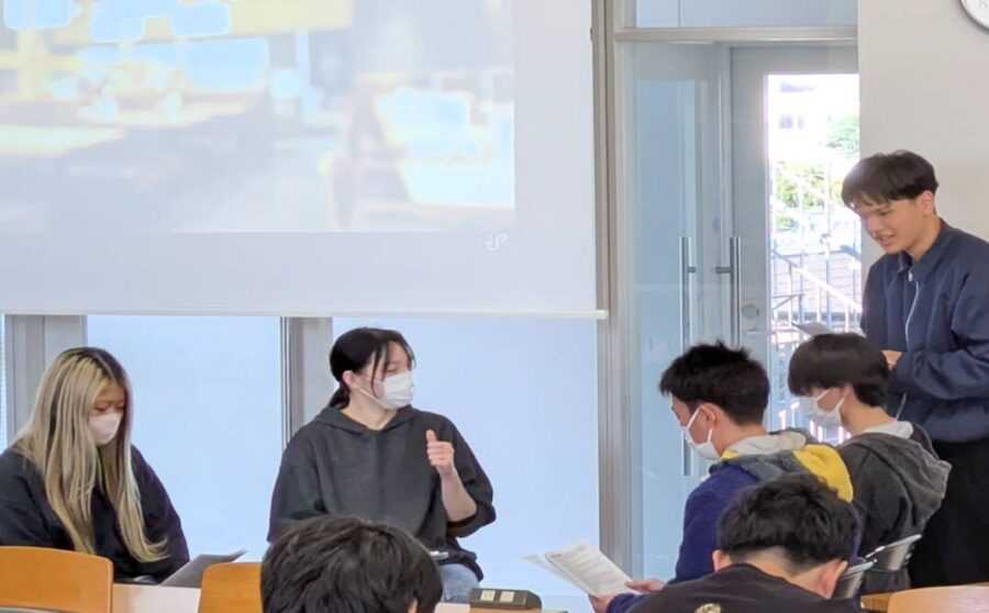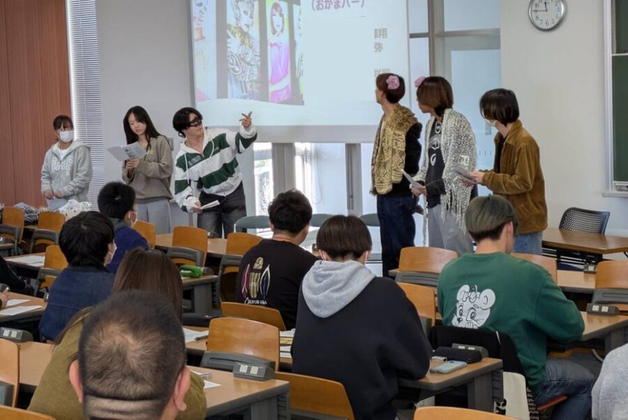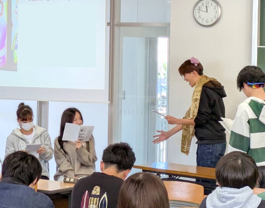 教育学部1年「文章表現」では、担当教員の坂東 実子講師が一風変わった方法で敬語を教えています。学生たちは敬語を座学で学んだ後、知識と敬語の活用を定着させるために、敬語をテーマにした演劇を行います。脚本の条件は、「A4で1枚程度」、「敬語を間違えて使った場面と、それを修正する場面を入れること」、「観客を笑わせること」です。単に正しい敬語の使い方を覚えるだけでは、真に敬語を理解したとは言えません。脚本づくりをグループ内で協同して「ネタ」を作り上げることで、自発的に敬語の使い方が身につき、なぜその場面での言葉づかいが正しくないのかを理解し説明できるようになります。「敬語劇」は2009年から行われており、今年で17年目となります。