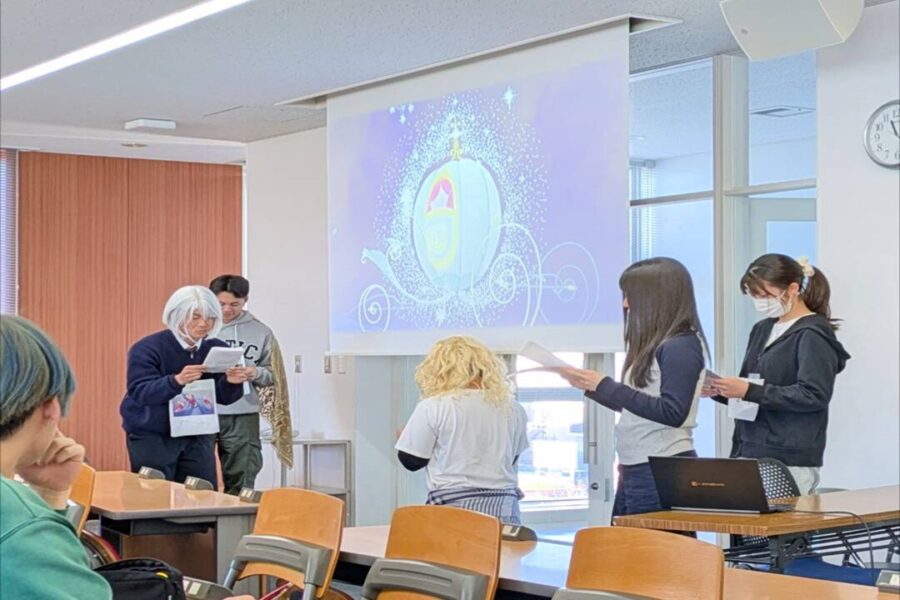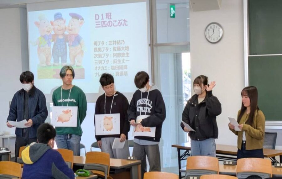 1班は「三匹のこぶた」です。長男33歳、次男30歳、三男25歳のニートの息子たちに、母ブタが、物価高で家計が苦しくなったので働きに出るよう告げ、彼らは就職面接に臨みます。衝撃のラストシーンに悲鳴があがりました。2班は「居酒屋合コン」。店員さんへの言葉使いが悪い男子はモテないと聞いて、はりきって過剰な敬語を使いまくるIくん。みんなに敬語のアドバイスを受けます。3班は「敬語のできないシンデレラ」。魔法でその日だけ敬語が話せるようになったシンデレラでしたが、舞踏会が終わり、王子が自分を探していると知ると、本気で敬語を身につけます。何よりも相手をリスペクトする気持ちが大事ということを伝えていました。4班は「ゲイカマン(おかまバー)」。二人の女の子がはじめて「おかまバー」に行き、№1のアゲハちゃんの接客を受けますが、敬語がひどすぎて「チェンジ」を要求します。かわりに登場したのが美しい敬語を話すギャラクシーちゃん。その素晴らしい接客を見たアゲハちゃんもがんばって敬語を学びます。どの班もメンバーたちが協力し合って集中して取り組んでいました。