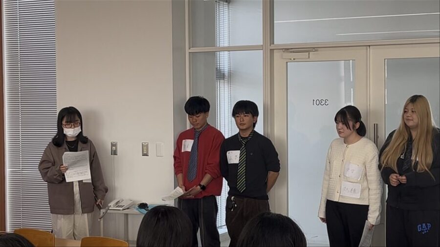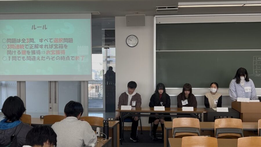 1班は「日本語ゼミ」というタイトルでした。留学生の疑問にゼミ仲間が答えるという設定です。普段何気なく使っているバイト敬語を適切な表現に直しました。2班の「結婚式」では、新郎の友人がおかしな敬語でスピーチをすると、敬語の妖精が召喚されます。妖精が「『ご結婚させられて』だと、無理やり結婚させられたみたいだよ」と指摘すると、客席からも笑い声があがりました。この劇では、結婚式で避けた方がいい言葉(忌み言葉)についても説明がありました。3班の劇は「契約成立」です。間違った敬語を使って取引先の信用を失った社員たちが、時を戻す妖精にチャンスを貰い、今度は完璧な敬語を使って無事に契約を成立させます。観覧に来てくださったゲストからは「会社という設定が現実的だった」という言葉を頂戴しました。4班は「クイズ番組」です。敬語クイズに全問正解すると宝を獲得できるという番組ですが、残念ながら全員失格になってしまいました。スクリーンと効果音を上手に取り入れており、本番に至るまでにグループ内で話し合いを重ねたことが窺える劇でした。