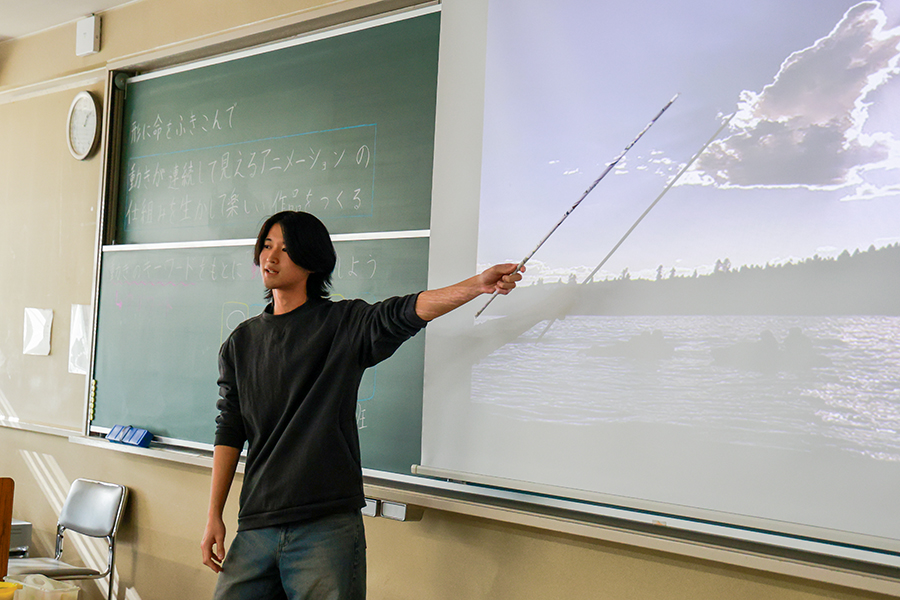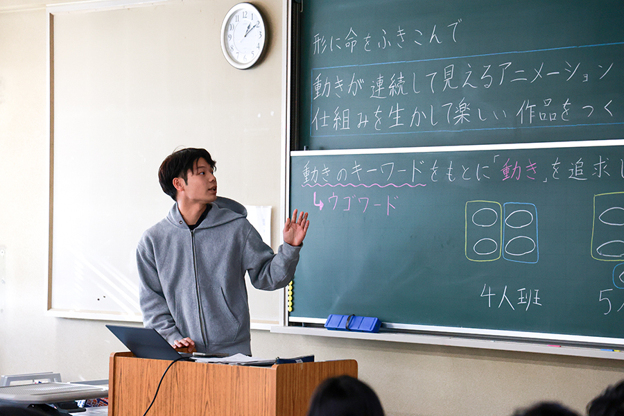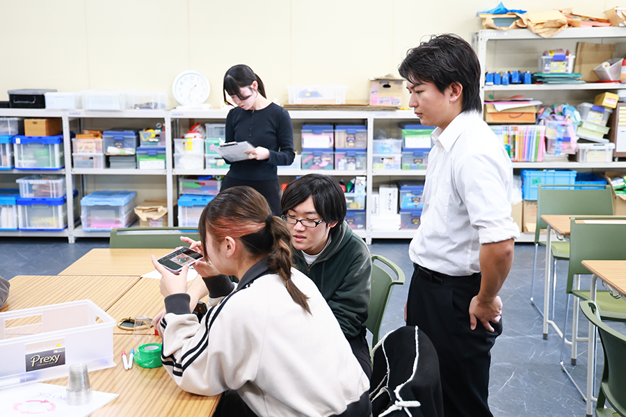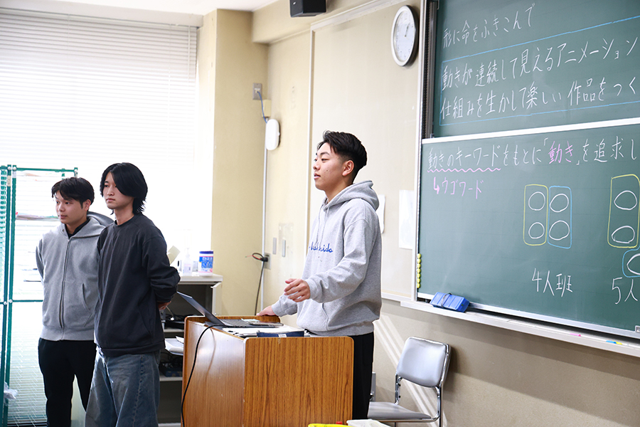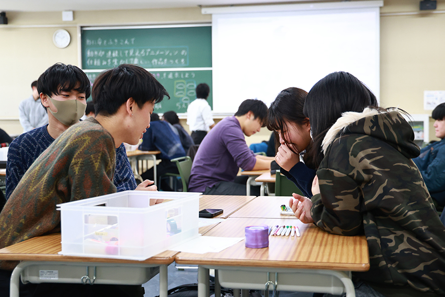 この授業では、模擬授業を担当する「授業者」、児童として授業を受ける「児童役」、第三者の視点で授業を観察し評価する「観察者」に役割を分けて授業を進めます。今回、授業者を務めたのは男子学生4名、題材名は「形に命をふきこんで」です。スマートフォンアプリを利用し、被写体を少しずつ動かしながら1コマずつ撮影し、連続再生することでアニメーションを制作していきます。