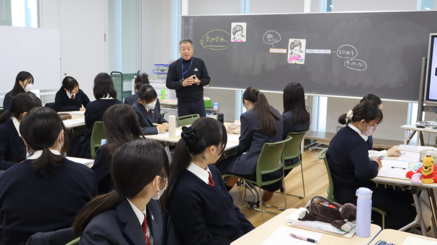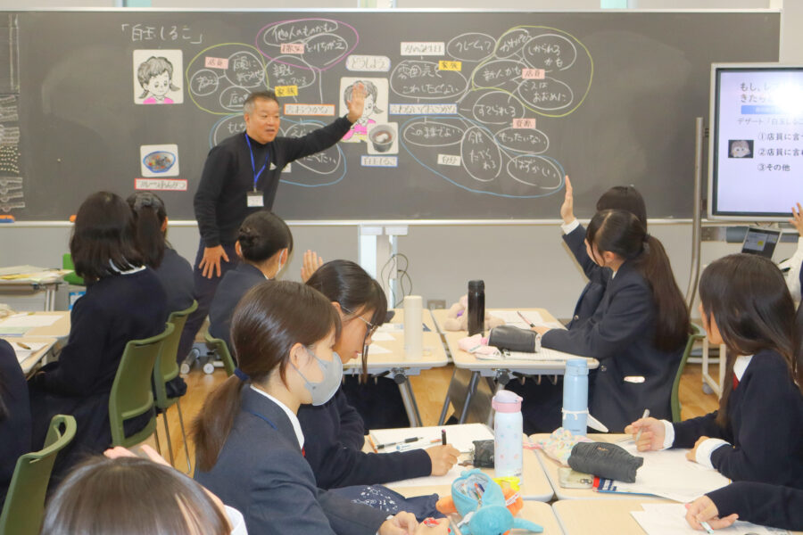 1限目「道徳」の授業では、教材「白玉しるこ」をもとに話し合いが進められました。ファミリーレストランで行われた家族の誕生日会における店員とのやりとりに関するもので、「自分が注文した白玉しること店員が持ってきた品が違っていたとき、間違いを指摘するか、それとも黙っているか」という問いです。ウェビングという手法を用いて課題に対して多面的・多角的に考えました。生徒さんからは、「誕生日会の雰囲気を壊したくない」、「恥ずかしい、勇気がない」など、様々な意見が出されました。「もしかしたら、両方食べられるかもしれないから言ってみる」という興味深い意見もあり、活発に意見が交わされました。