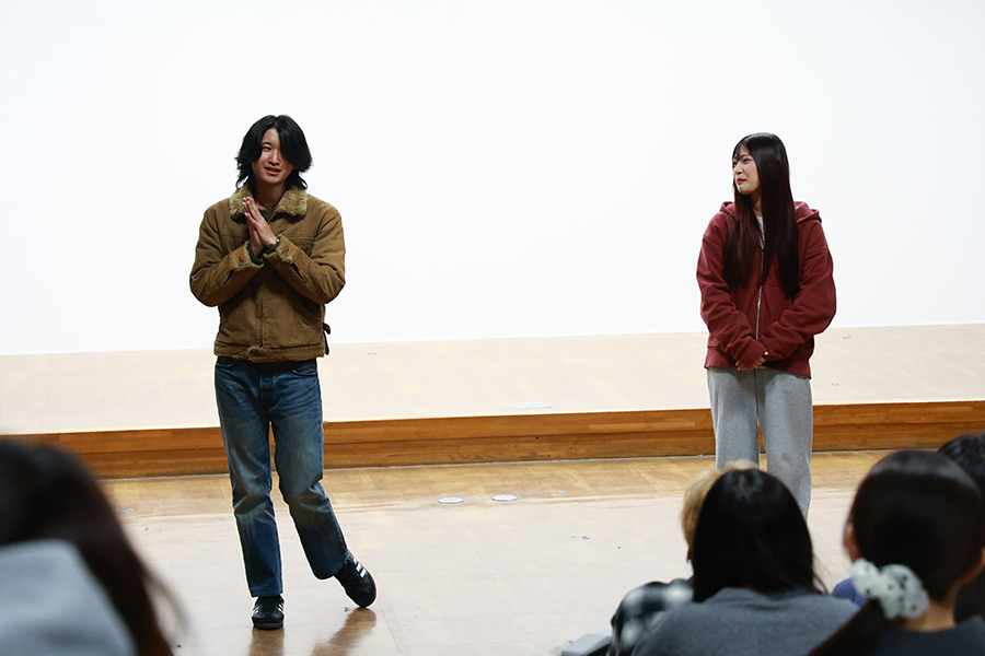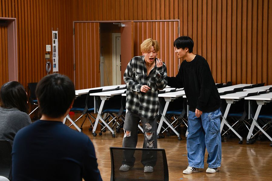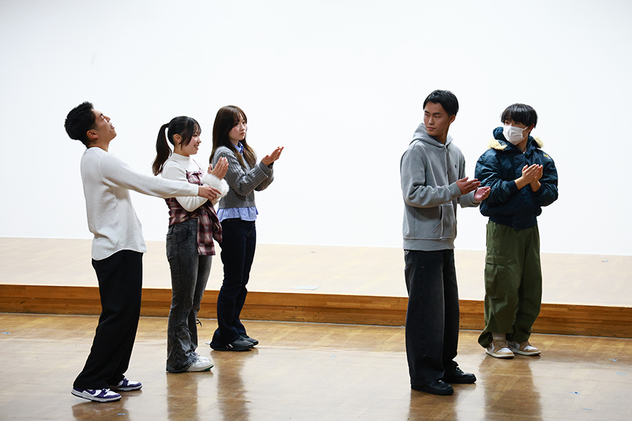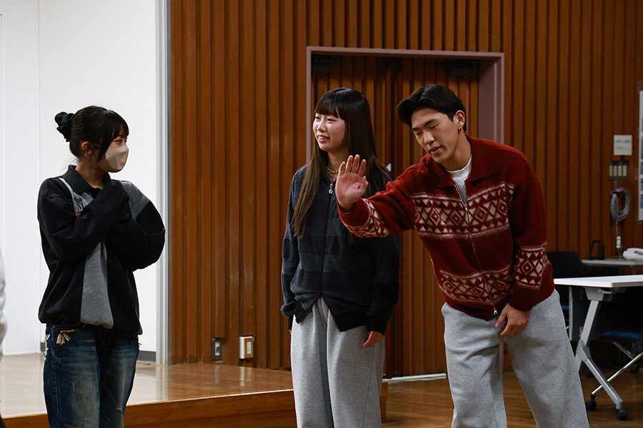 教員を目指す学生にとって、演劇は専門外の学びに映るかもしれません。しかし、教育現場では、言葉の内容だけでなく、声の強弱や間の取り方、視線や身体の動きといった要素が、子どもの理解や安心感に大きく影響します。演劇を通じて身に付ける表現力は、授業づくりや学級経営の場面でも生かされる力です。さらに、作品を創作する過程では、テーマを掘り下げ、構成を練り、伝え方を検討します。まさに、大学で学びや、社会での実践に欠かせない営みなのです。