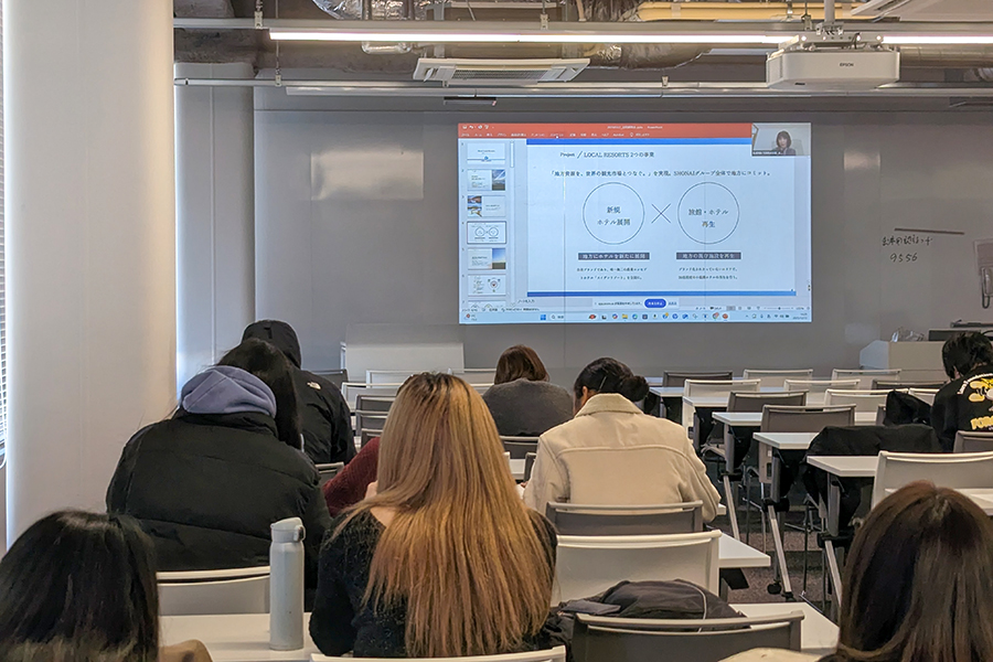 続いて、オンラインで山形県鶴岡市とつなぎ、インターンシップでお世話になった川俣聖子氏が、SUIDEN TERRASSEの概要を写真とともに紹介しました。「サステナブルチャレンジ」という5つの取組や、ビジネスモデルを横展開する計画、自由度が高く手厚い福利厚生などにも触れ、学生にとっては宿泊業の新たな将来性を具体的に知る機会となりました。