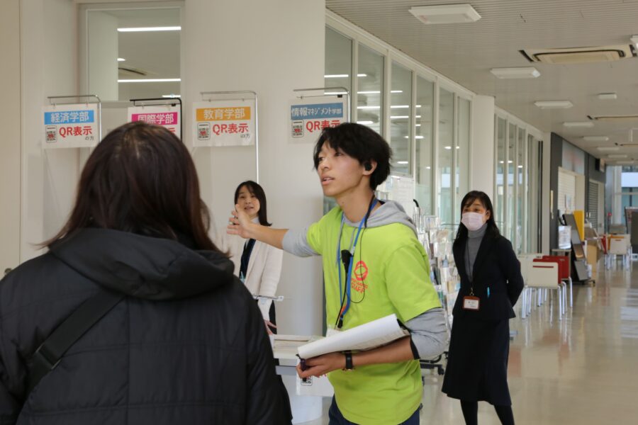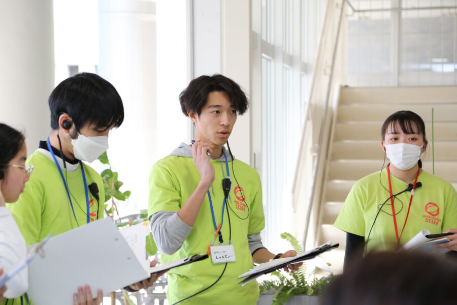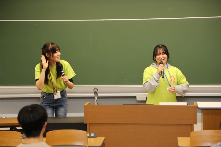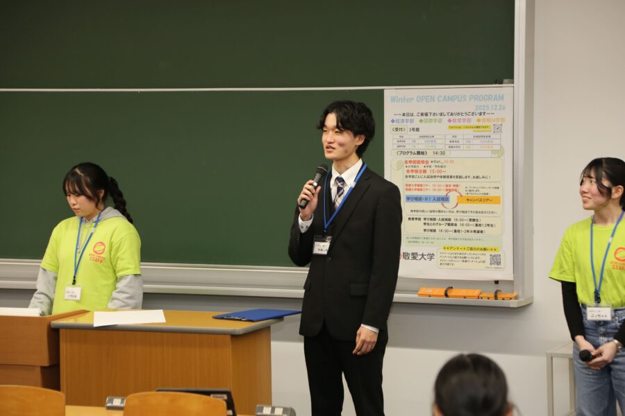 全体説明会では、学生たちが自分の言葉で大学の魅力を紹介。参加者の皆さんも、最初は少し緊張した面持ちでしたが、