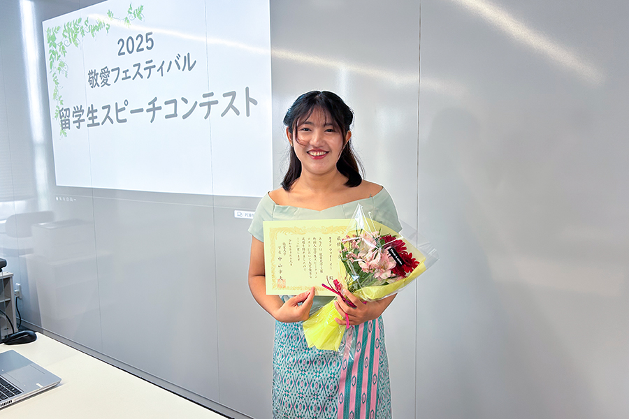 10月19日(日)の敬愛フェスティバルでは、「留学生によるスピーチコンテスト」が今年度も行われました。日本で学び・暮らす留学生たちが“日本での生活で感じたこと”“経験を通じて得た気づき”を日本語で語りました。言語を学ぶ過程だけではなく、異文化のなかで育んだ思いや成長の軌跡がスピーチに込められました。