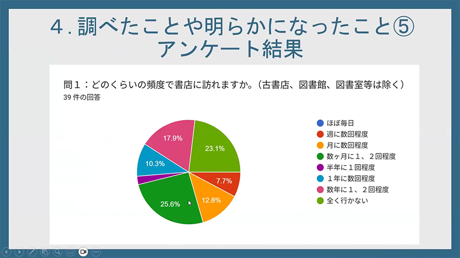 Hさんは、書店数が減少している背景を、出版社・取次・物流など出版流通の仕組みと、読者側の需要の変化の両面から整理しました。統計データの分析に加え、学生へのアンケートも取り入れ、書店を取り巻く現状を多角的に考察しました。