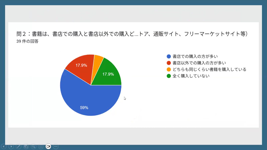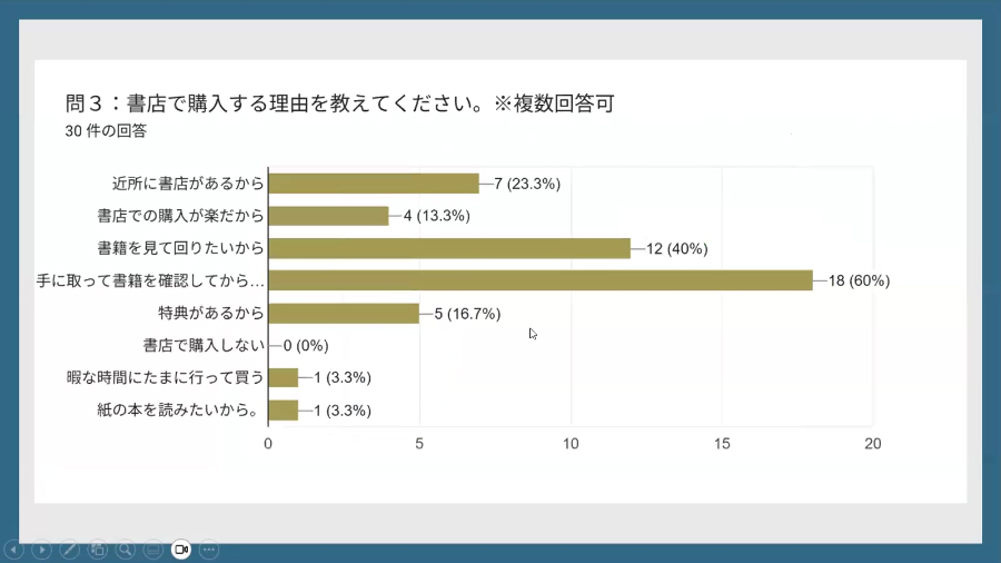 また、発表後、教員からの質問に答える形で、書籍の売り上げは減少傾向ではあるものの、書籍そのものの魅力は失われていないとの見方も示しました。書店と読者の距離を縮めるイベント「ブックフェア」の盛況ぶりをふまえると、よりコアなファン層を獲得しているようにも見えます。また、シェア型書店や地域に根差した書店など、地域のコミュニティを活かした小型書店の可能性も示されました。