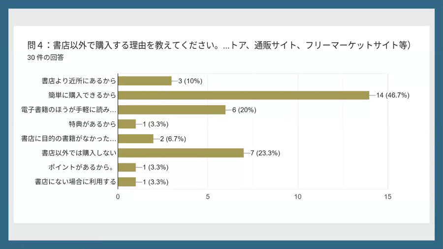 Hさん自身は、書店以外での購入がもっと多いと予想していたため、書店以外では購入しないとする学生が想像以上に多かった点を「予想外だった」と振り返りました。調査結果からは、学生たちがニーズに応じて購入手段を使い分けており、利便性を重視する場面ではネット通販や電子書籍を選びつつ、内容を吟味したいときや新たな本との出会いを求める場面では書店を選ぶ傾向が見えてきたといいます。